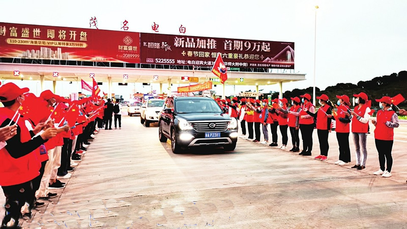 交警和志愿者在高速路出口列队欢迎英雄归来。
