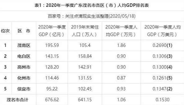 茂南区2020年一季度人均GDP远超全国人均水平